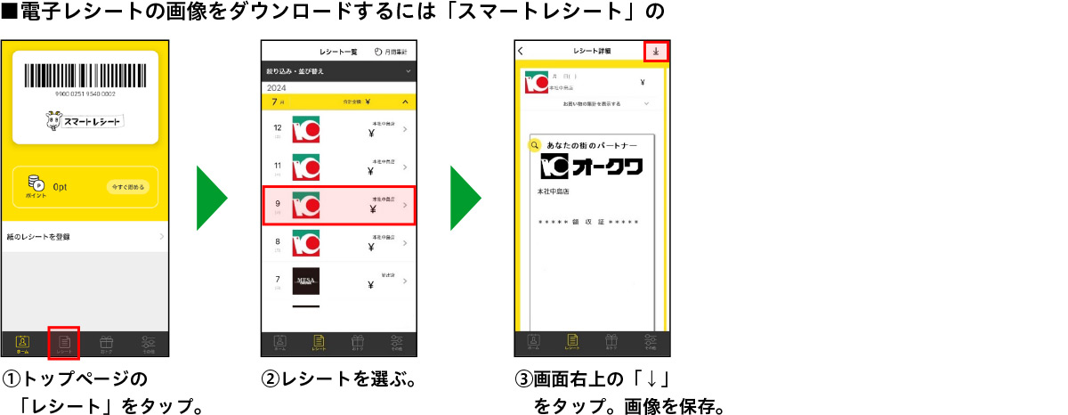 ・「オークワアプリ」→「電子レシート」→「メニュー」→「もっと便利に、もっとおトクに!(詳細はこちら)」→アプリをダウンロード。