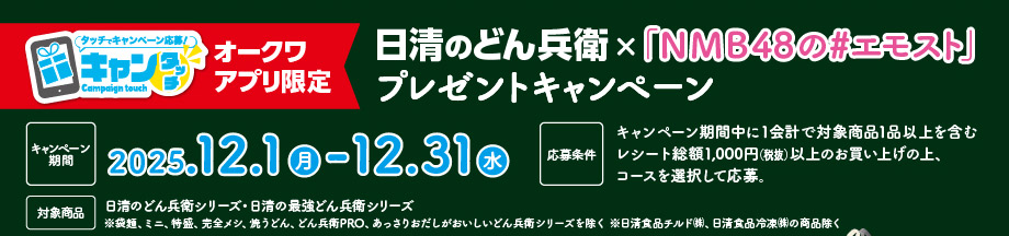 オークワアプリ限定 日清のどん兵衛×「NMB48の#エモスト」プレゼントキャンペーン(有効期間:12/1から12/31まで)