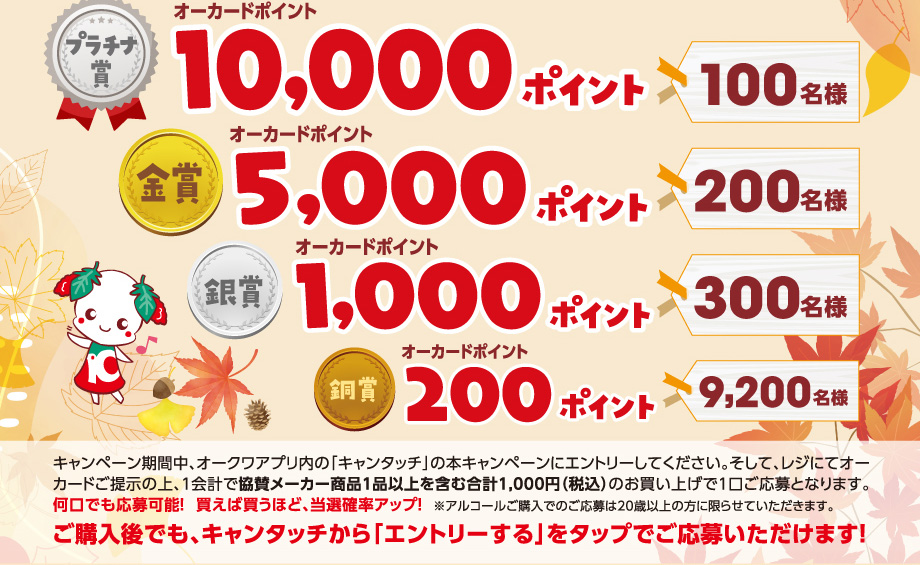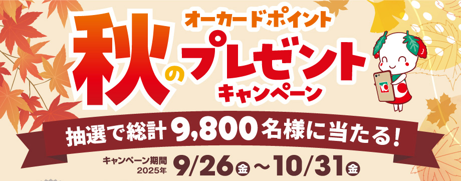 オークワアプリ会員様限定企画 「秋のオーカードポイントプレゼントキャンペーン」(有効期間:9/26から10/31まで)