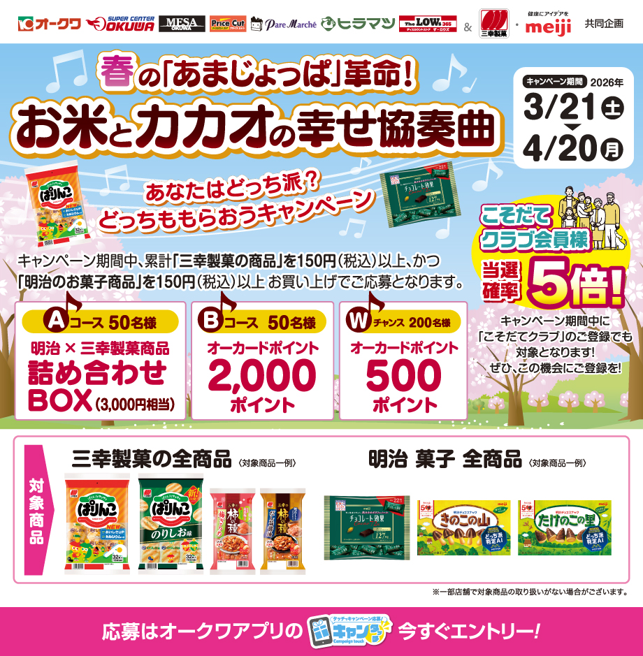 オークワアプリ限定「三幸製菓・明治共同企画 春の「あまじょっぱ」革命! お米とカカオの幸せ協奏曲」キャンペーン(有効期間:2026/3/21から4/20まで)
