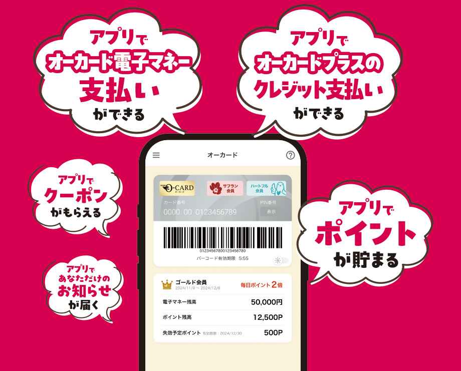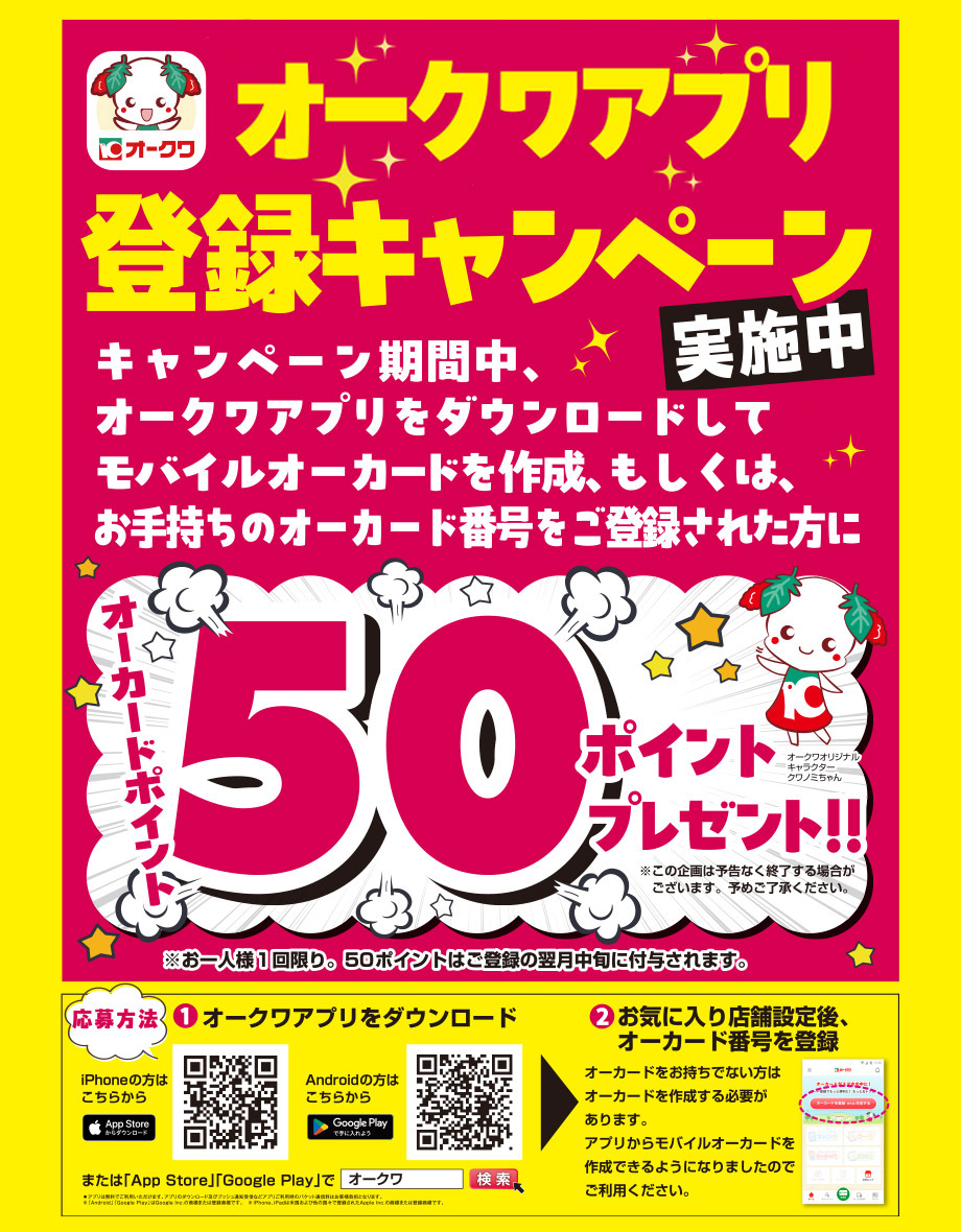 ※「お誕生月クーポン」配信につきましては、お誕生月の2ヶ月前までにオークワアプリにオーカード番号をご登録された方が対象となります。