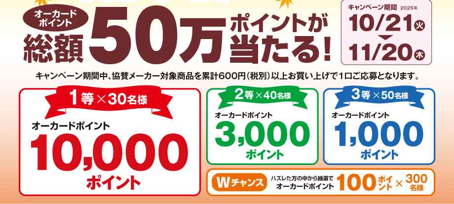 オークワアプリ限定「秋のワクワクキャンペーン オーカードポイント総額50万ポイントが当たる!」(有効期間:2025年10/21から11/20まで)