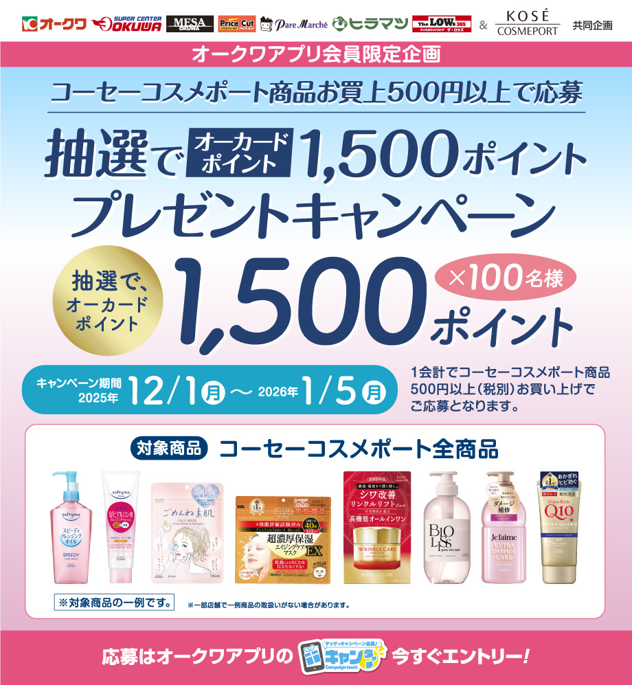 オークワアプリ限定「コーセーコスメポート商品を買って、抽選でオーカードポイント1,500ポイントプレゼントキャンペーン」(有効期間:2025/12/1から2026/1/5まで)