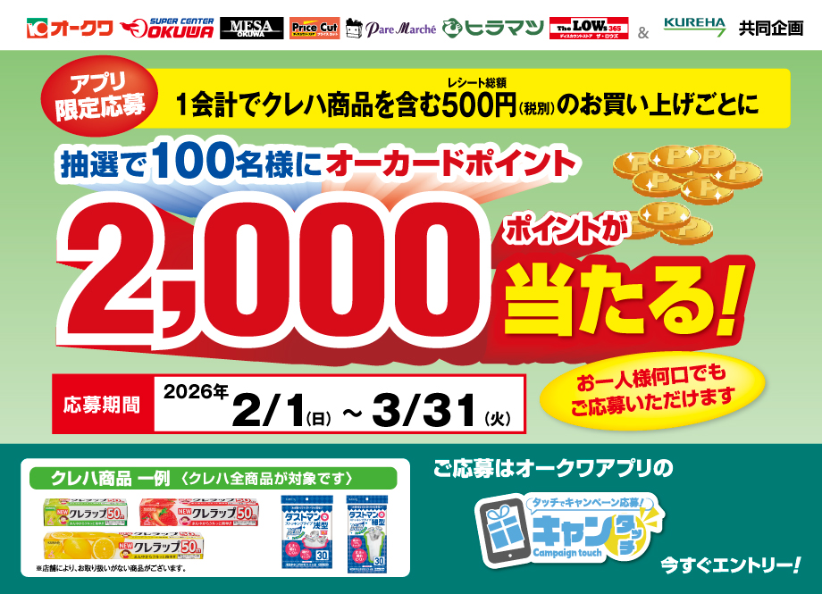 オークワ×クレハ共同企画「クレハ商品購入で、オーカードポイント2,000ptを抽選で100名様にプレゼント!」(有効期間:2/1から3/31まで)