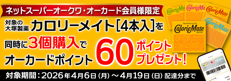 キャンペーン期間中に、ネットスーパーでカロリーメイト対象商品3個ご購入毎にオーカードポイントを60ポイントプレゼントいたします。