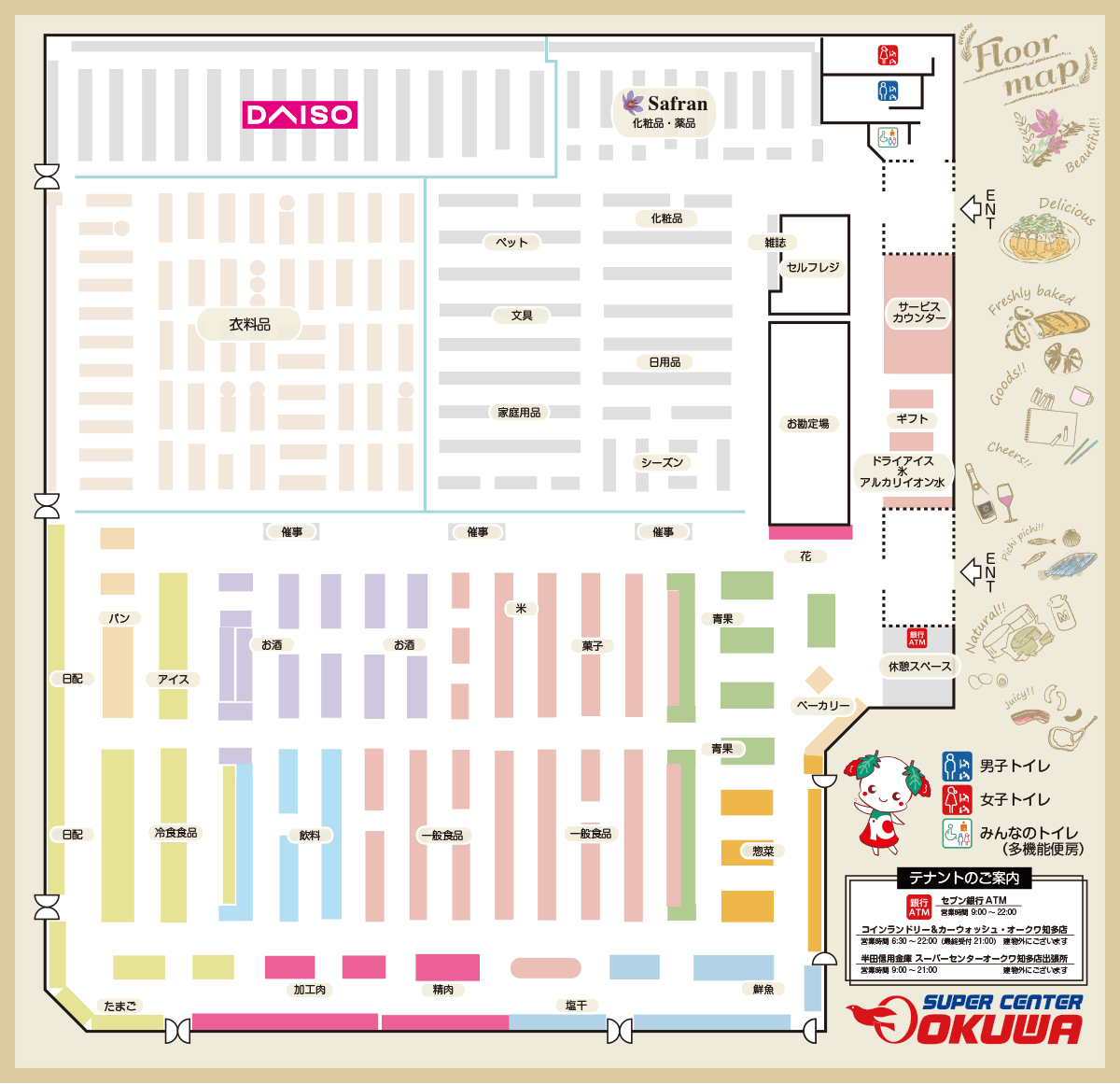 食料品、酒類、ベーカリー、衣料品(婦人服、紳士服、子供服、服飾雑貨、肌着靴下、寝装品)、住居関連用品、化粧品、薬品、日用品、家庭用品、ペット用品、花、文具